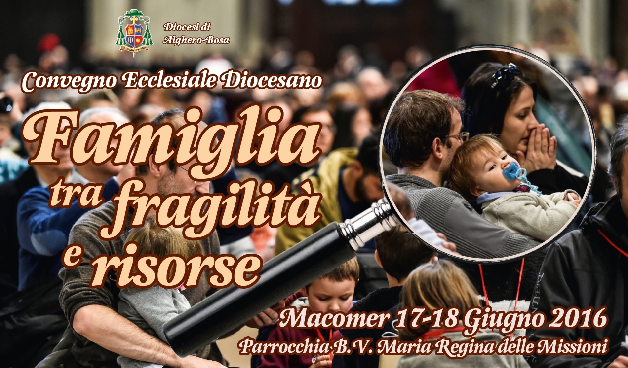 Venerdì 17 e Sabato 18 Giugno, nella parrocchia della Beata Vergine Maria Regina delle Missioni in Macomer, la Chiesa di Alghero-Bosa vivrà il suo sesto Convegno ecclesiale diocesano. Quest’anno il tema sarà “Famiglia tra fragilità e risorse” e vedrà come relatori il Direttore dell’Ufficio Catechistico Nazionale Mons. Paolo Sartor e la professoressa Franca Feliziani Kannheiser.