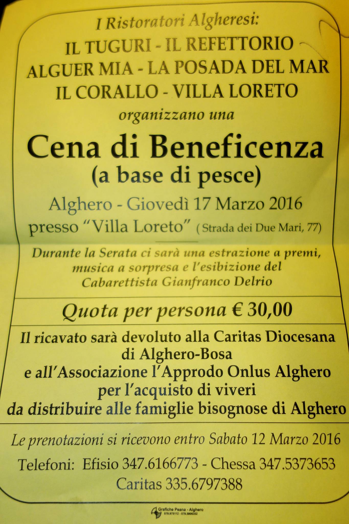 I gestori dei ristoranti il Tuguri, il Refettorio, Alguer Mia, la Posada del Mar, Il Corallo e Villa Loreto, organizzano una Cena di Beneficenza per Giovedì 17 Marzo 2016 alle ore 20,00 presso Villa Loreto. I ristoratori ed i loro Staff di cucina e di sala presteranno la loro opera a titolo gratuito per la preparazione della cena nella struttura di Villa Loreto, anch’essa messa a disposizione gratuitamente.
