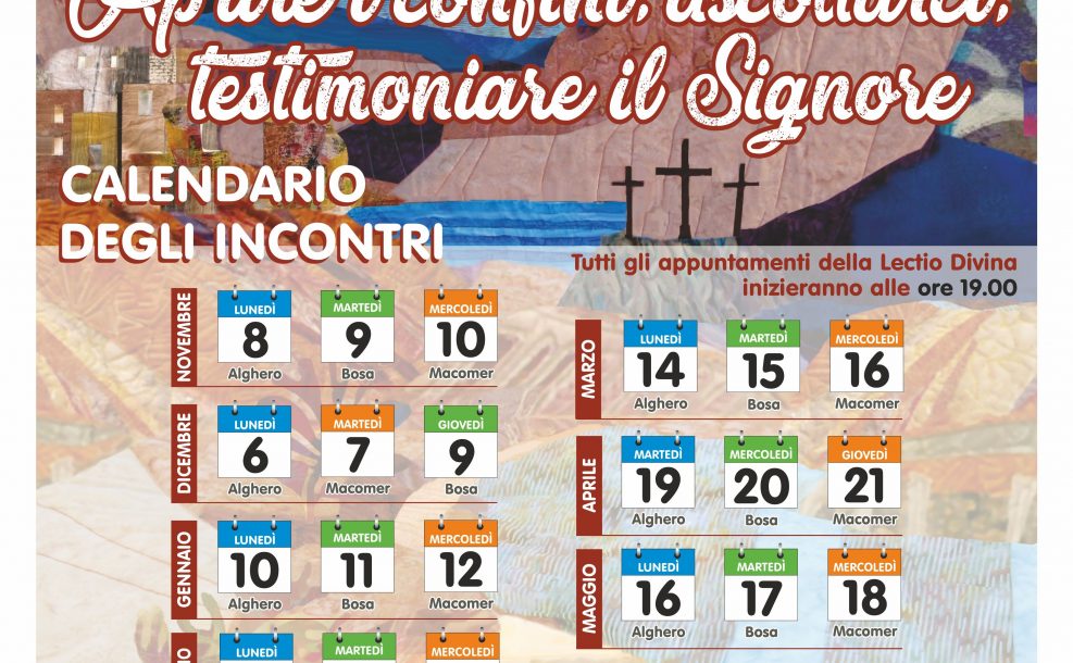 Si comunica che, a causa della situazione pandemica che ha visto, in questi giorni, l’innalzamento della curva dei contagi in tutte le nostre Comunità, gli incontri foraniali di Lectio divina previsti per il mese di Gennaio (Lunedì 10 ad Alghero, Martedì 11 a Macomer e Giovedì 12 a Bosa) sono annullati.