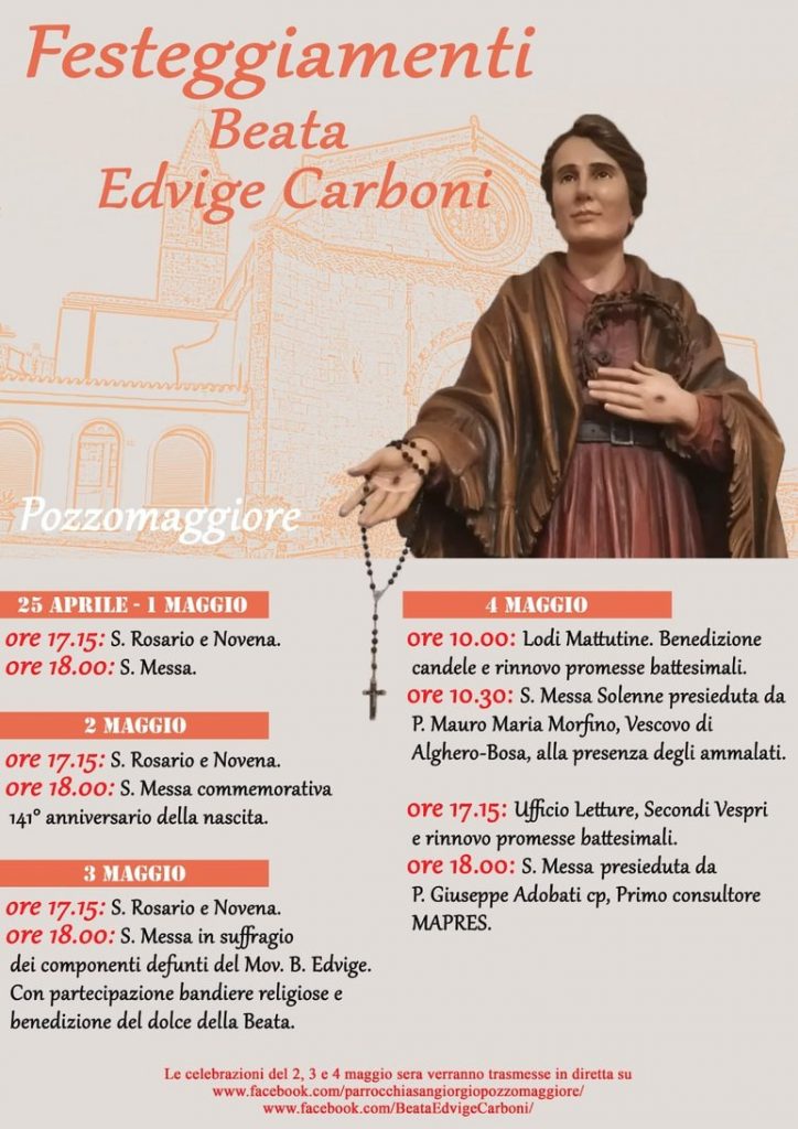Diocesi in festa per la Beata Edvige Carboni Posted on 3 Maggio 20213 Maggio 2021 by Giuseppe Manunta Martedì 4 Maggio ricorre la festa della Beata Edvige Carboni. Di seguito il programma delle celebrazioni che sarà possibile seguire anche dalle pagine Facebook della parrocchia e del Comitato Beata Edvige Carboni