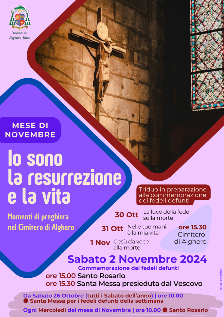 In occasione della Commemorazione dei fedeli defunti la Pastorale del Cimitero di Alghero coordinata da Don Gianni Nieddu insieme al collaboratore Padre Sebastiano Martinez, O de M., propone alcuni momenti di preghiera in preparazione al 2 Novembre, che avranno come filo conduttore la frase “Io sono la resurrezione e la vita”.