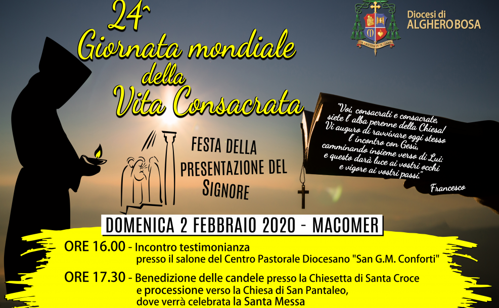 In occasione della XXIV Giornata della Vita Consacrata, le religiose e i religiosi della Diocesi di Alghero-Bosa si incontreranno, Domenica 2 Febbraio, nel Centro Pastorale diocesano “San Guido M. Conforti” a Macomer dove, dalla tarda mattinata, vivranno un momento di condivisione e preghiera.