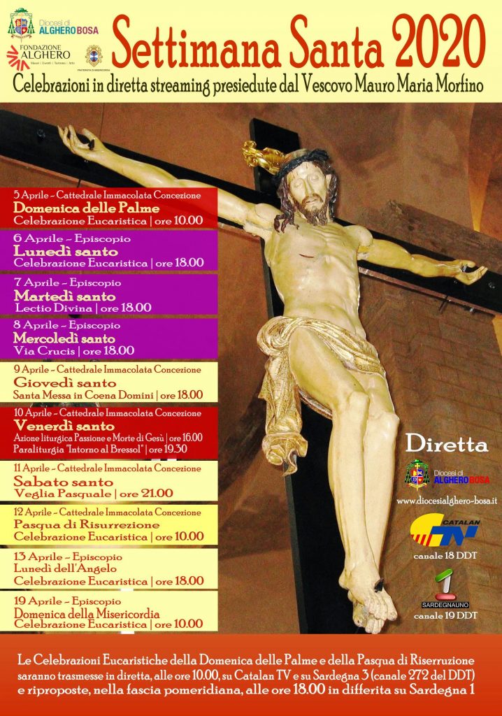 Le Celebrazioni Eucaristiche della Domenica delle Palme e della Pasqua di Risurrezione saranno trasmesse in diretta su Catalan TV e su Sardegna 3 (canale 272 del DTT), e riproposte alle ore 18.00 in differita su Sardegna 1.