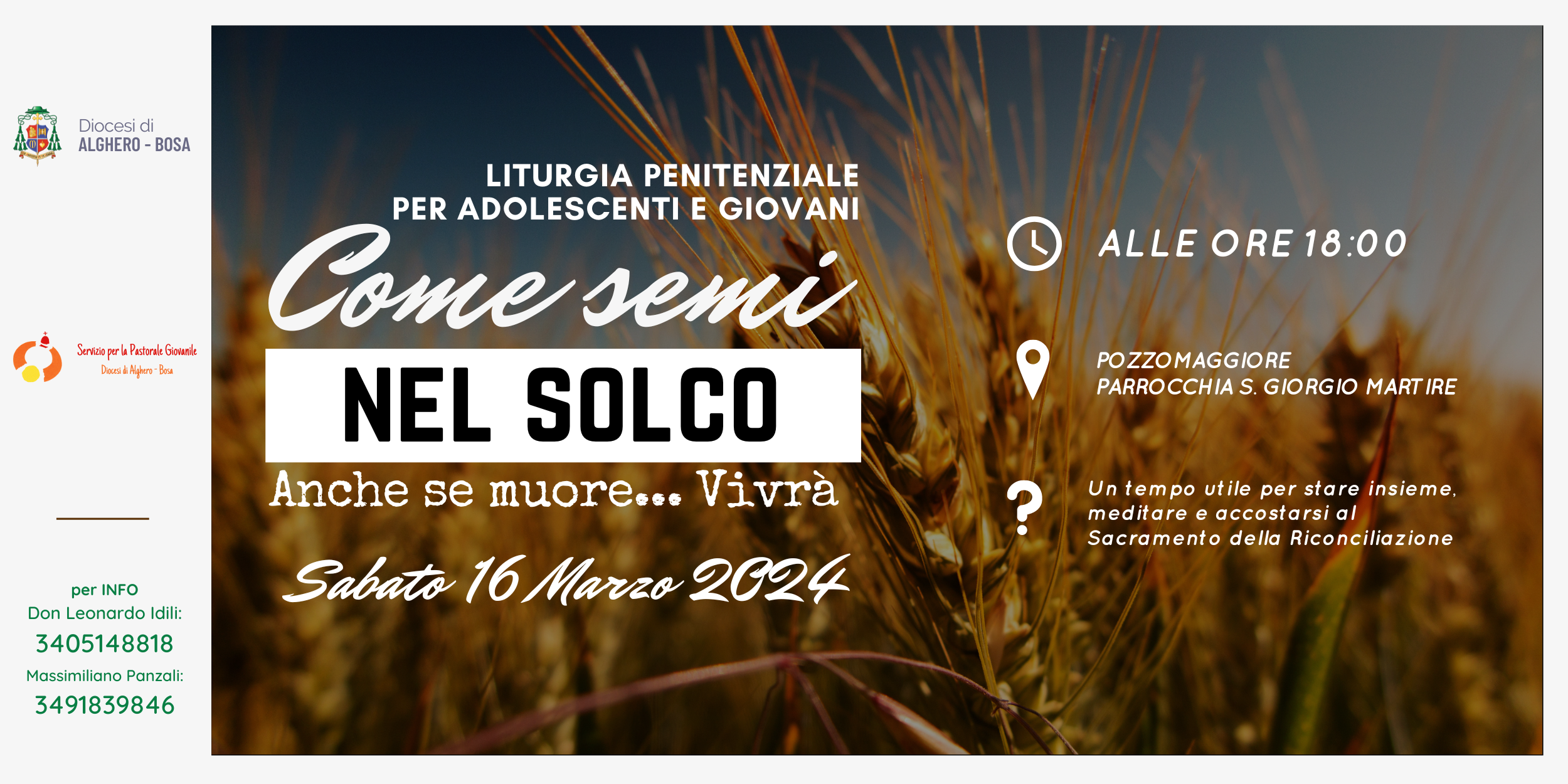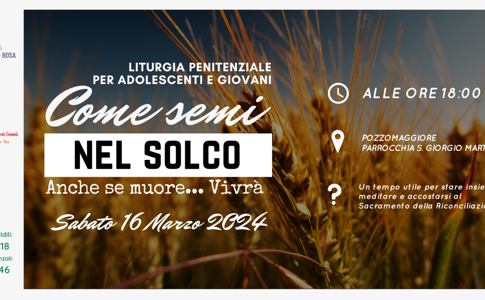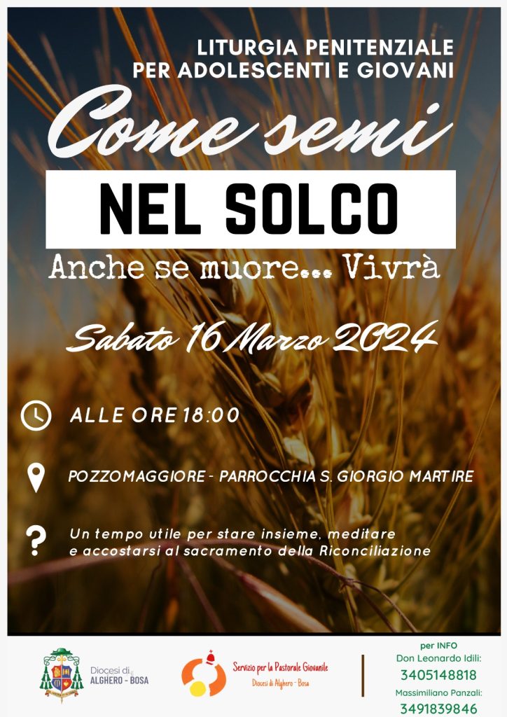 I Co-direttori del Servizio per la Pastorale Giovanile, Don Leonardo Idili e Massimiliano Panzali, insieme ai referenti foraniali e alle relative equipe, invitano tutti i giovani della Diocesi di Alghero-Bosa che hanno già compiuto 14 anni alla Liturgia Penitenziale per Adolescenti e Giovani “Come semi nel solco” Anche se muore… Vivrà organizzata Sabato 16 Marzo2024 a Pozzomaggiore alle ore 18.00.