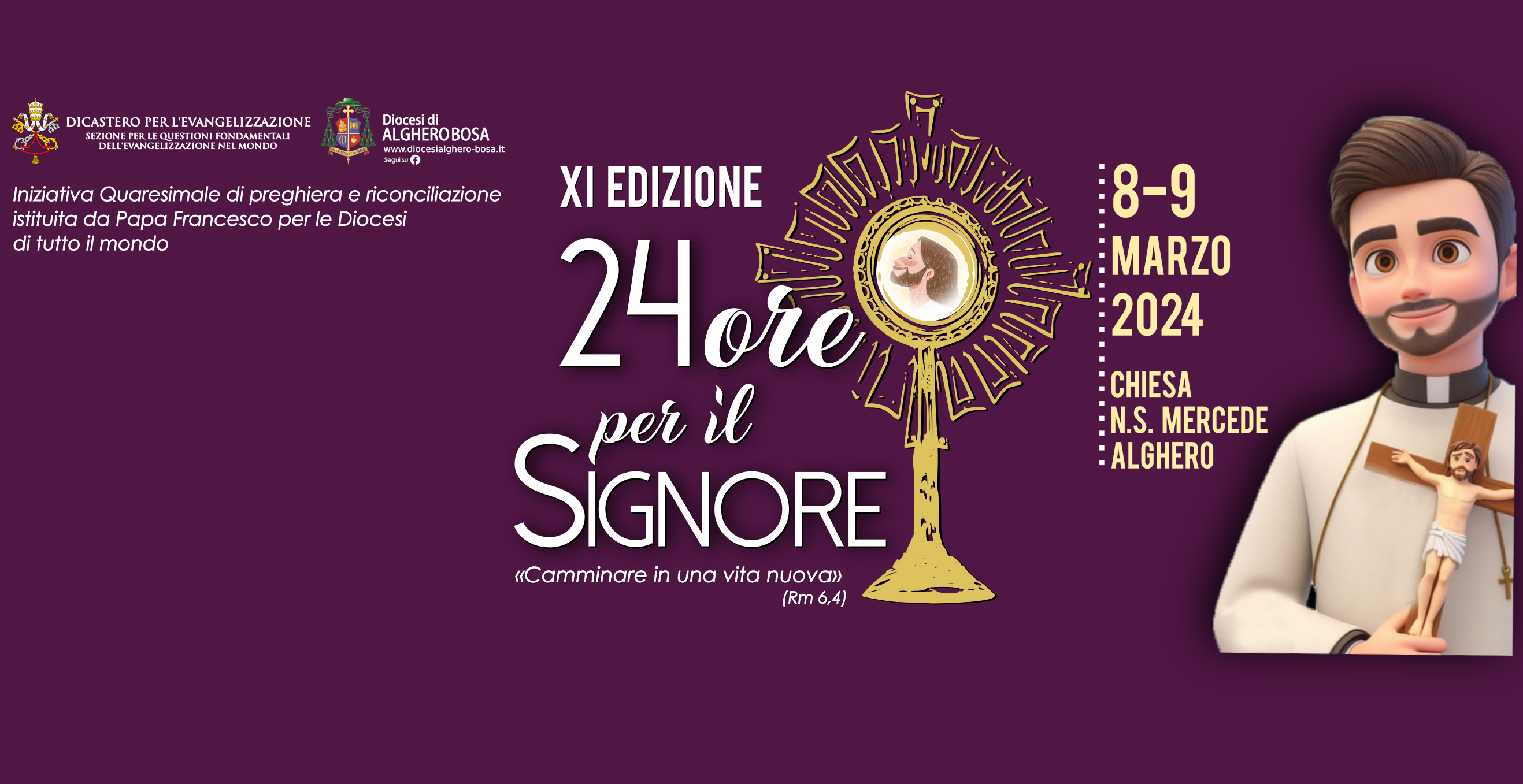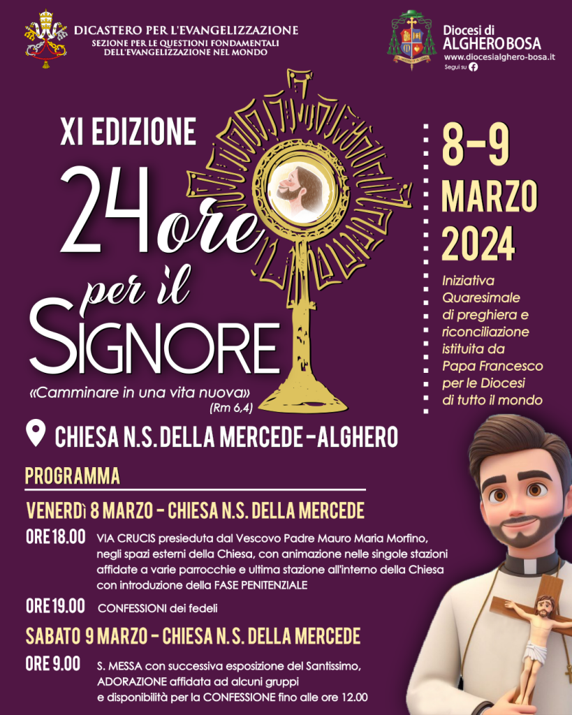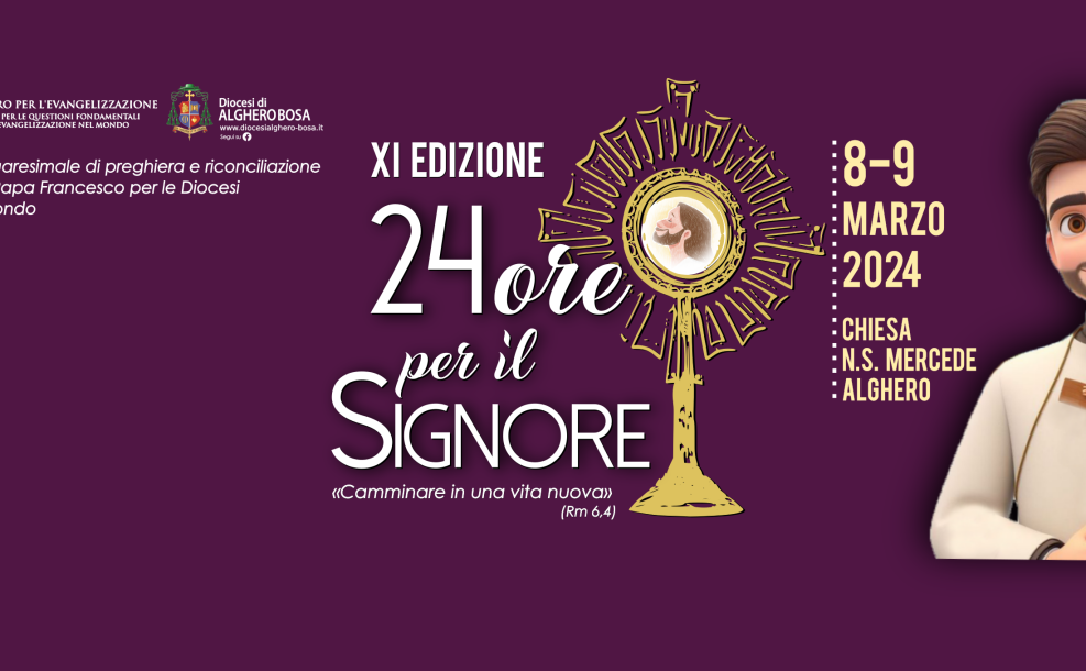 Per l’undicesimo anno consecutivo ad Alghero e Macomer, rispettivamente nella Parrocchia di N.S. della Mercede e nelle quattro Comunità macomeresi, saranno ospitate le 24 ore per il Signore, l’iniziativa di preghiera e riconciliazione fortemente voluta da Papa Francesco e accolta nella nostra Diocesi.
