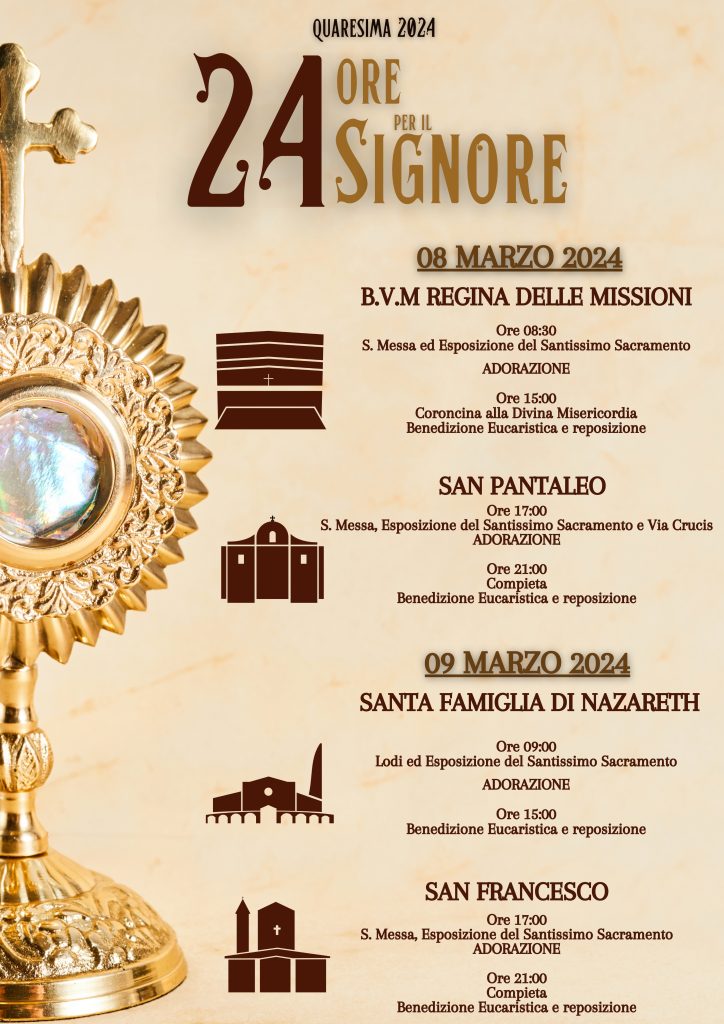 Le due giornate dell’8 e del 9 di Marzo si articoleranno tra momenti di preghiera e riflessione – nella pratica della Via Crucis e nell’Adorazione Eucaristica – e di riconciliazione – con diverse occasioni per potersi accostare al Sacramento del Perdono.