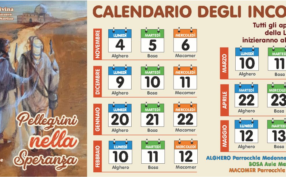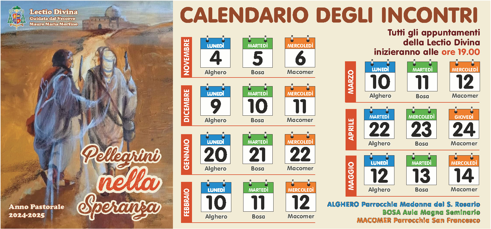 Si comunica che, rispetto a quanto riportato nella locandina e nel Calendario diocesano, nel mese di Aprile la Lectio divina è spostata ai giorni martedì 22 (Alghero), mercoledì 23 (Bosa) e giovedì 24 (Macomer)