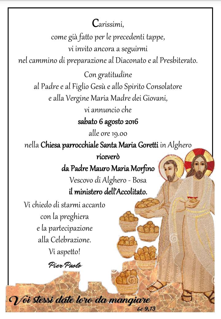 Con gratitudine al Padre e al Figlio Gesù e allo Spirito Consolatore, e alla Vergine Maria Madre dei Giovani, vi annuncio che, sabato 6 agosto 2016 alle ore 19.00 nella Chiesa parrocchiale Santa Maria Goretti in Alghero, mi sarà conferito dal nostro vescovo Padre Mauro Maria il ministero dell’Accolitato.