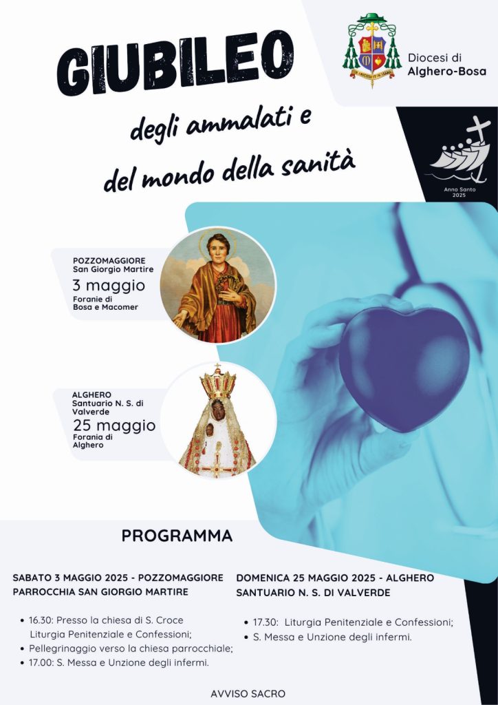 Come da programma diocesano, saranno due le date relative al Giubileo dei malati, delle persone con disabilità, degli operatori sanitari e dei volontari: Sabato 3 Maggio a Pozzomaggiore, coinvolgendo le foranie di Macomer e Bosa, mentre Domenica 25 Maggio si vivrà un momento analogo nel Santuario di N.S. di Valverde che interesserà la Forania di Alghero.
