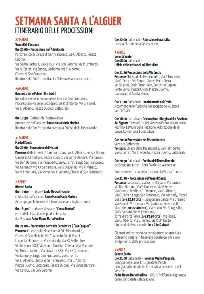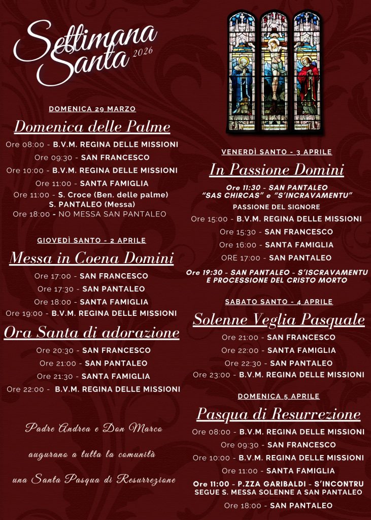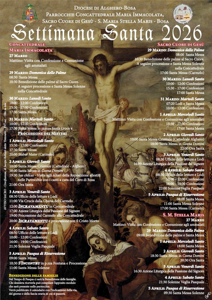 Pubblichiamo di seguito le locandine che mostrano i vari appuntamenti nei tre principali centri foraniali – Alghero, Bosa e Macomer – mentre per quanto concerne le altre parrocchie della Diocesi si rimanda alle rispettive pagine social e/o agli spazi virtuali di WhatsApp dedicati.